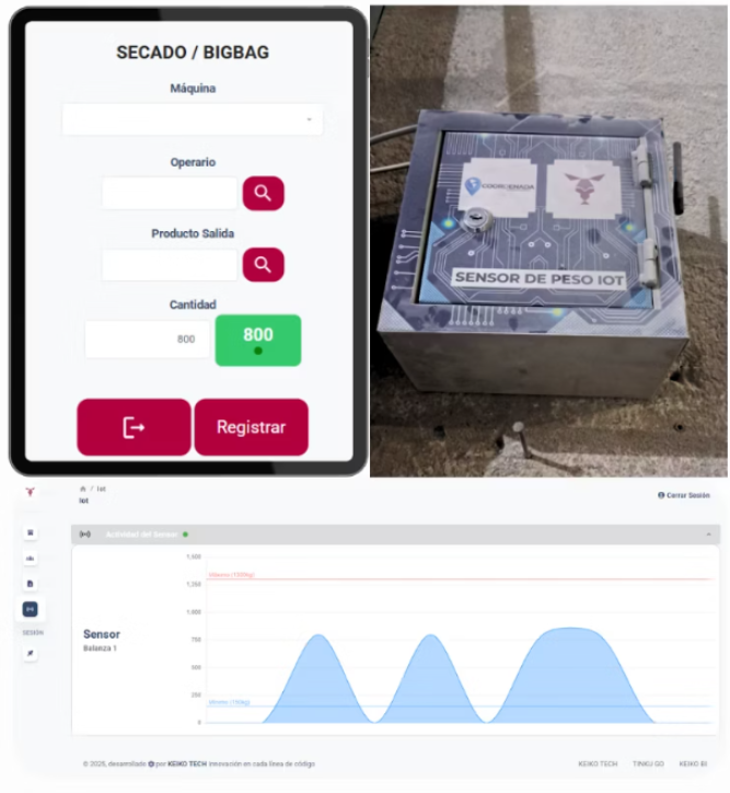 Los encargados registran el peso de los productos (en BigBags o unidades) al salir de cada máquina. El sistema identifica el producto, operario y máquina automáticamente. ¡Y la mejor parte! Sensores avanzados se encargan de capturar el peso de las balanzas para agilizar este proceso, especialmente en BigBags.