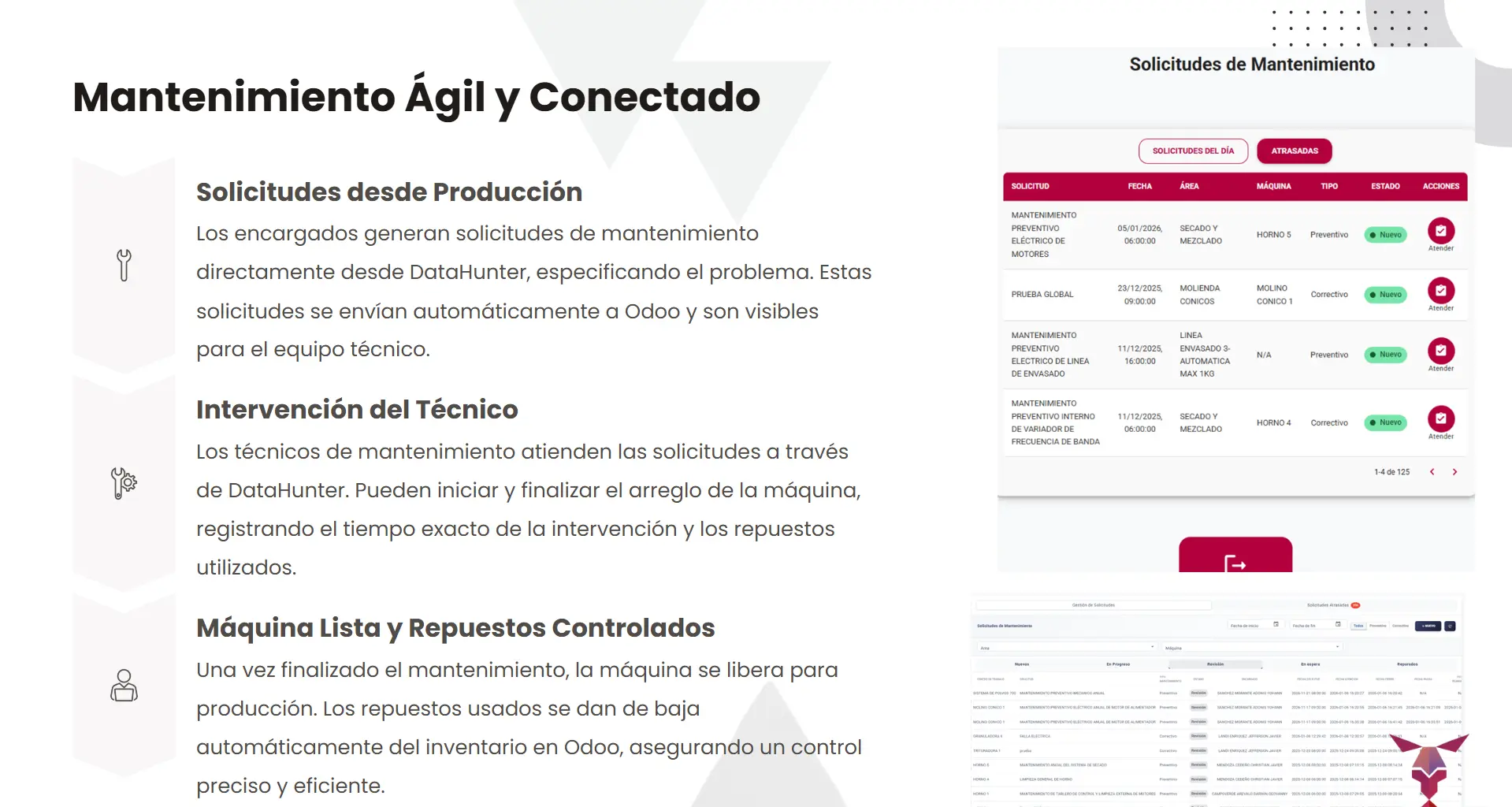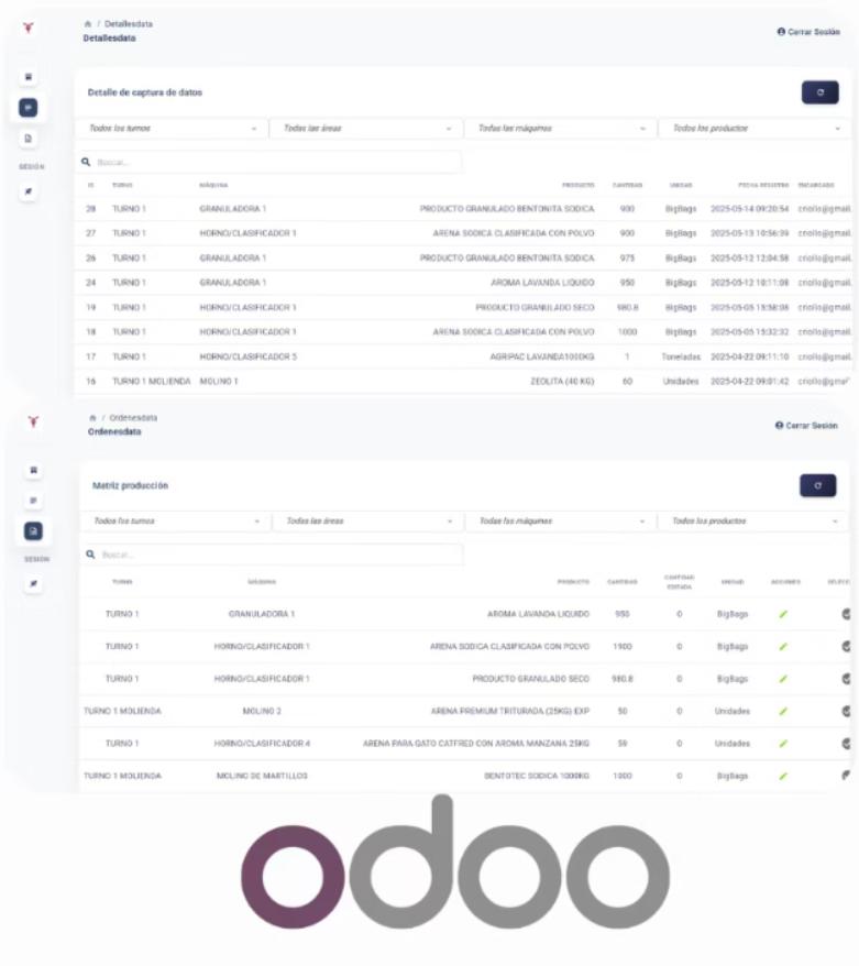 Al final de cada turno, el supervisor revisa los registros de peso, puede ajustarlos y agrupa la producción. Con un solo clic, se genera una Orden de Fabricación en Odoo, lo que permite el control de inventario y el seguimiento del flujo productivo. Todo conectado para una gestión sin fisuras.